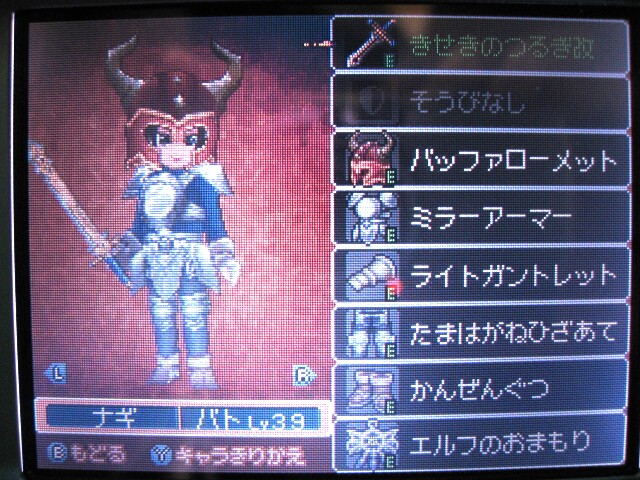ミラーアーマーとエルフのおまもり以外は全部錬金製。メットがダサイ。